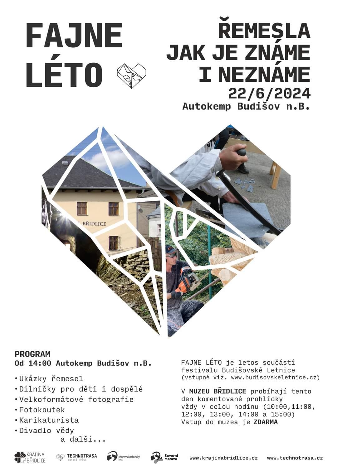 Součástí dotace je také akce FAJNÉ LÉTO – Hornický den v Krajině břidlice proběhne letos v září u nás v Budišově, jeho součástí bude Mistrovství ČR ve stříhání břidlice, soutěž pro děti, tvořivé dílničky, pouliční kulturní program a nesmí chybět místní specialita – hornická svačinka. Na závěr Hornického dne budeme v zahradě Muzea břidlice promítat dokumenty a fotografie o těžbě břidlice.